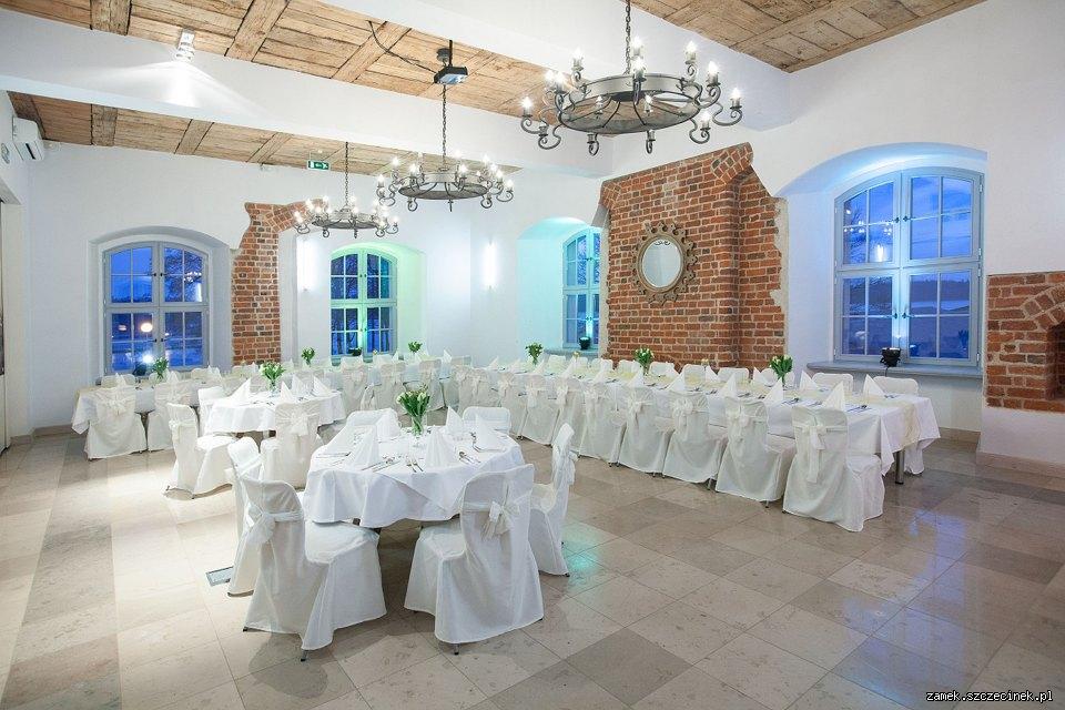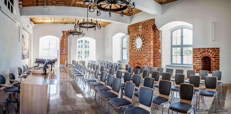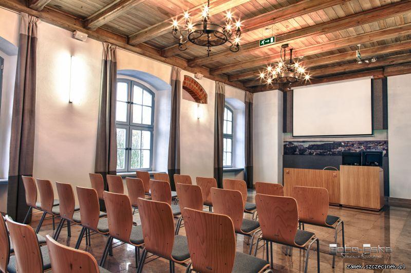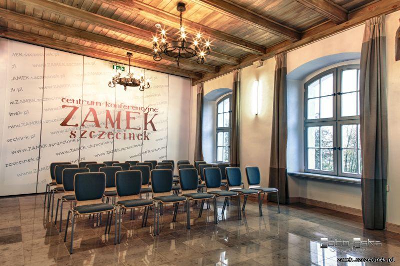Sala Konferencyjna Zachodnia – elegancka sala usytuowana w zachodniej części budynku. Tutaj w pełni realizuje się myśl przewodnia całego Centrum Konferencyjnego ZAMEK. Pięknie zachowane i odrestaurowane belki stropowe oraz ściany ukazujące wiekowe cegły pięknie harmonizują ze stylowymi, metalowymi żyrandolami. W te wszystkie historyczne elementy umiejętnie wkomponowano nowoczesny sprzęt konferencyjny. Uroku całości dodaje przepiękny fortepian i ciekawe, duże lustro. Sala w układzie kinowym mieści nawet do 70 osób.
